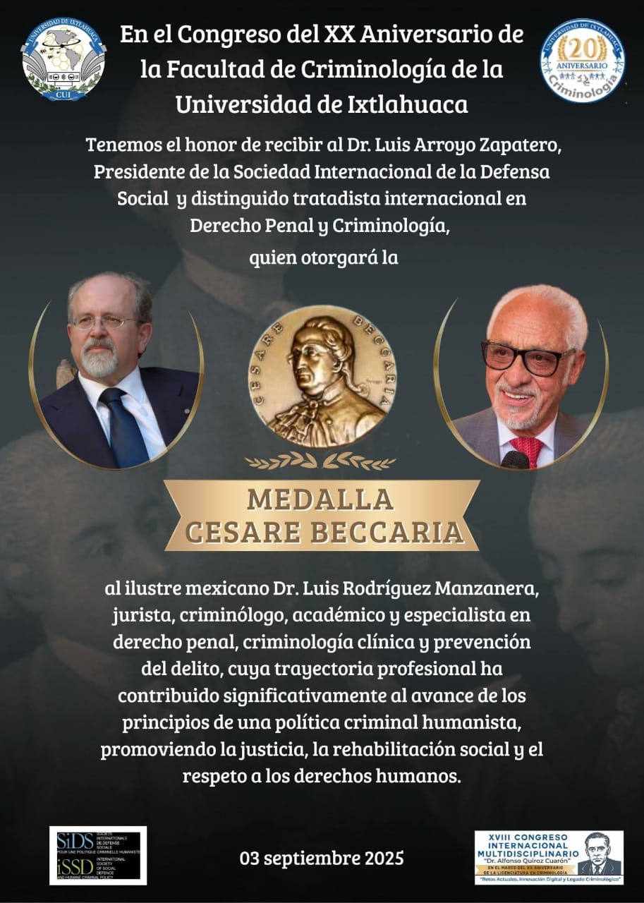 Durante el congreso conmemorativo, se contará con la distinguida presencia del Dr. Luis Arroyo Zapatero, Presidente de la Sociedad Internacional de la Defensa Social y reconocido tratadista internacional en Derecho Penal y Criminología. En el marco de esta celebración, el Dr. Arroyo Zapatero otorgará la Medalla Cesare Beccaria, un reconocimiento que honra la trayectoria y aportaciones sobresalientes en la disciplina criminológica.